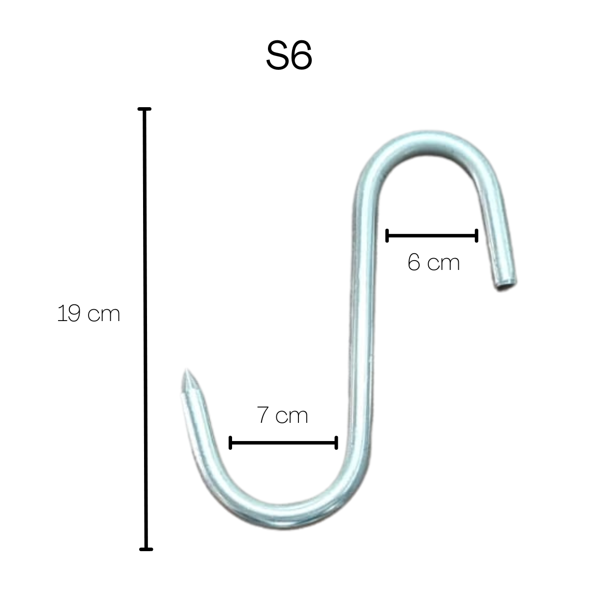 Formato: Forma de "S" com ponta afiada para facilitar a penetração na carne.